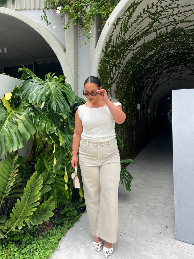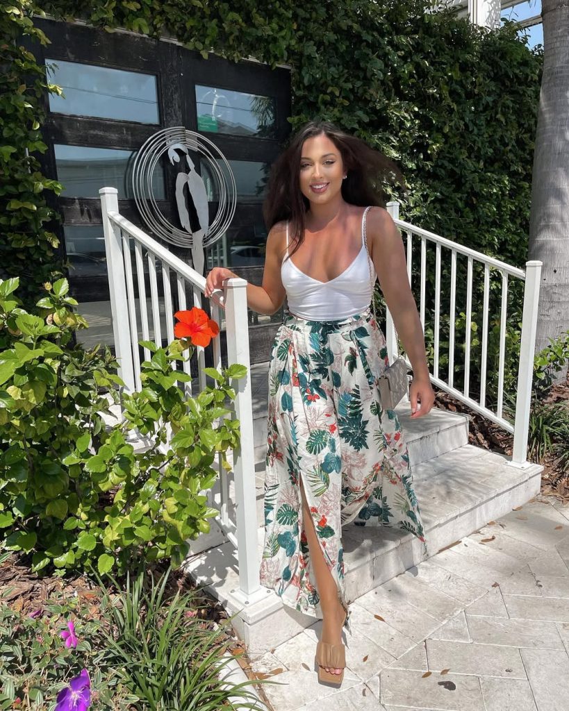A bright white tank paired with a breezy, leaf-printed slit skirt and neutral heels brings resort energy to any brunch table, even if you’re not on vacation.
