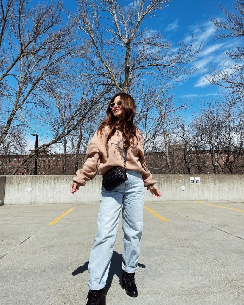 An oversized sand-colored sweatshirt, slouchy light jeans, and sturdy boots create a relaxed, cozy outfit that feels made for cool-weather brunch runs and long drives for delicious pancakes.