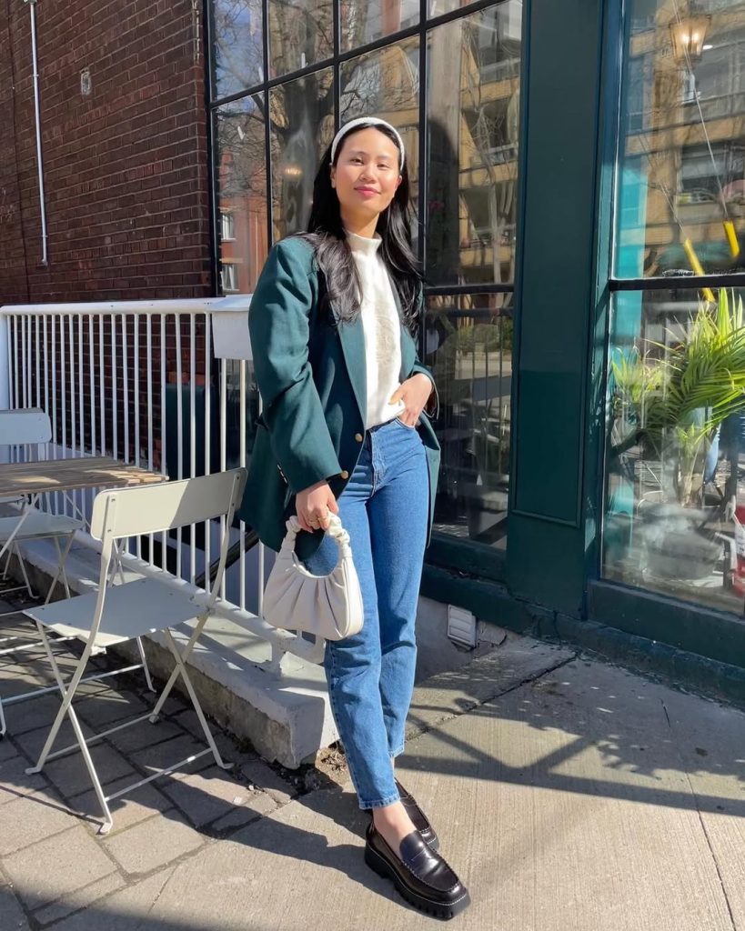 The classic Emerald and loafers combo. The green blazer paired with a white tank, straight-leg denim, and black loafers makes up the ultimate chic and modern Aussie brunch outfit.
