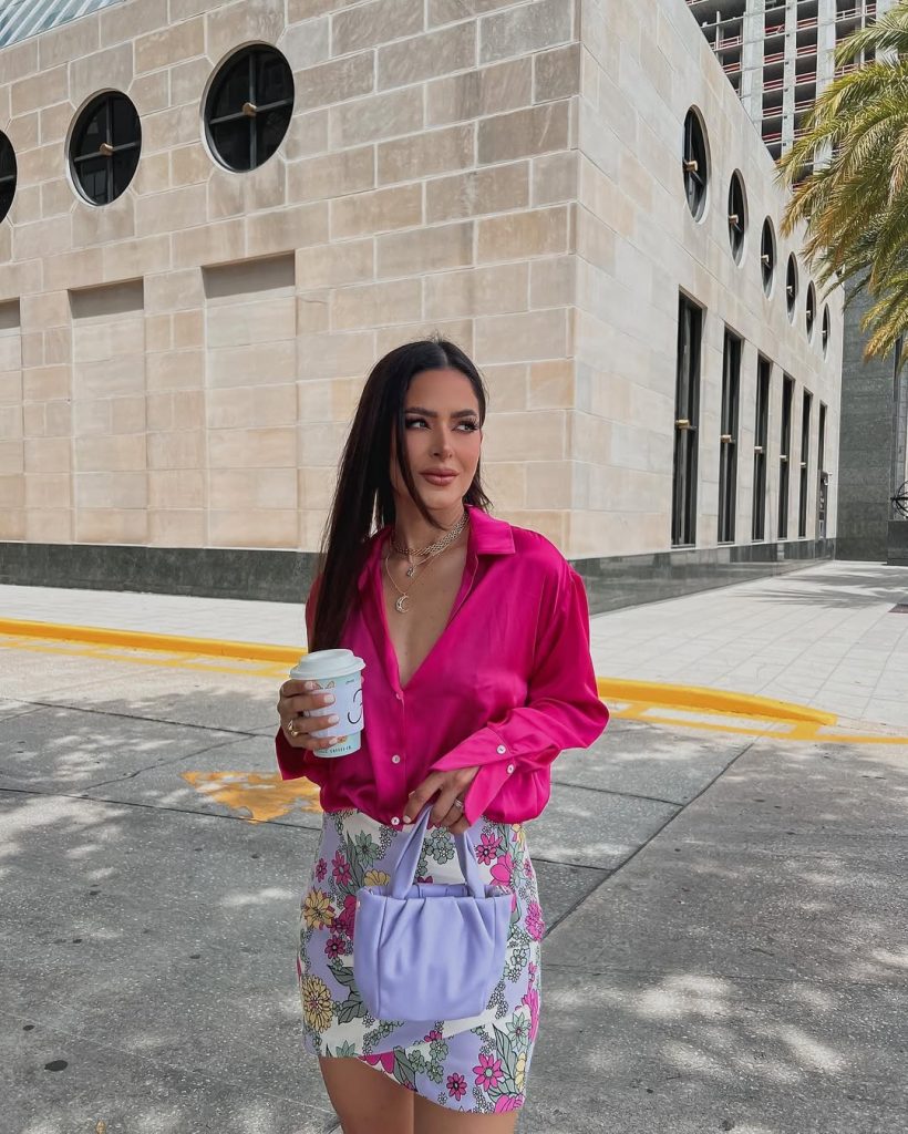 A vivid fuchsia satin shirt tucked into a floral mini skirt with a lilac bag brings joyful color to any casual summer coffee or brunch date.