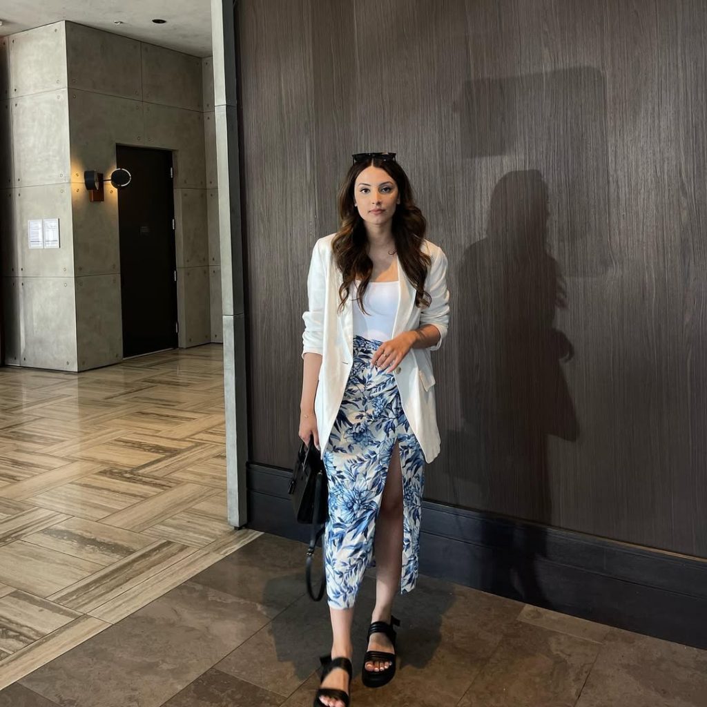 A crisp white blazer layered over a white tank and blue tropical slit skirt, grounded with black sandals, strikes a polished yet relaxed classy note.