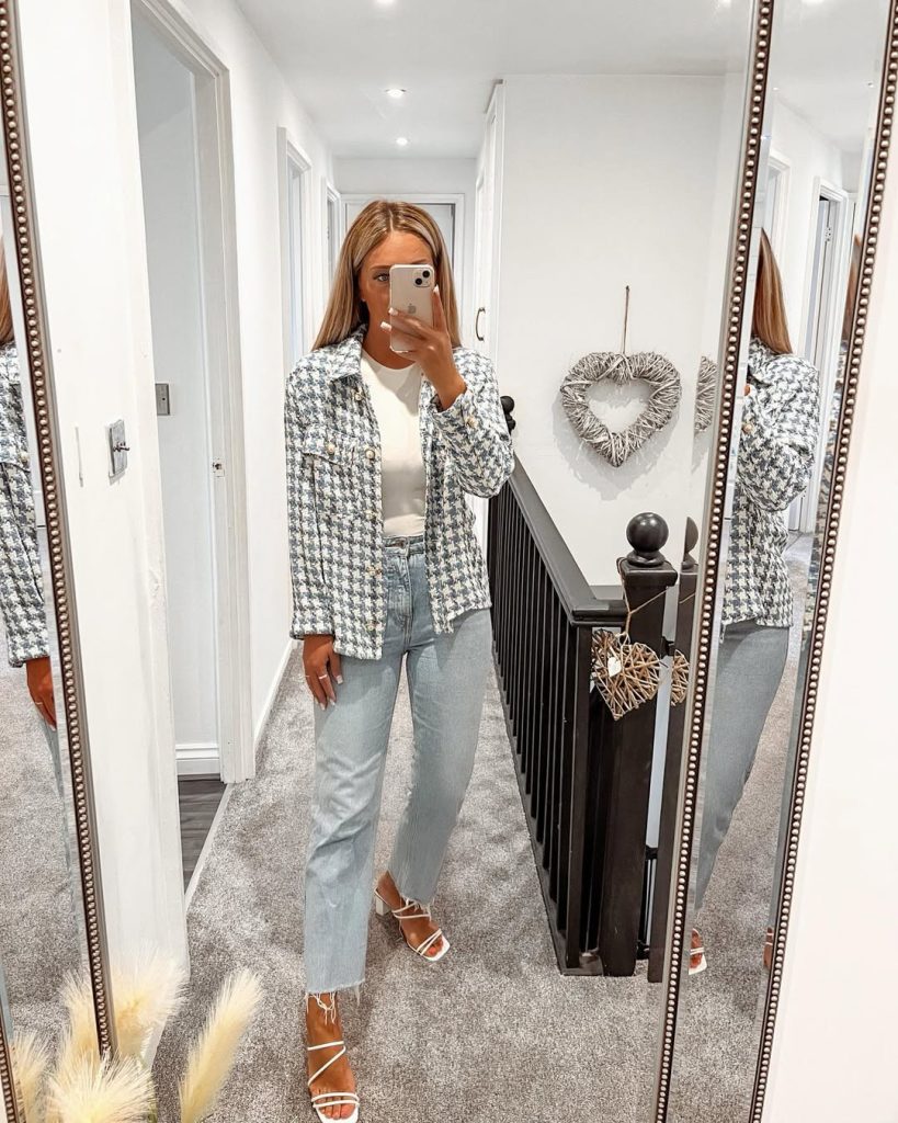 Tweed Shacket & Straight Jeans: Hallway Mirror Brunch Check