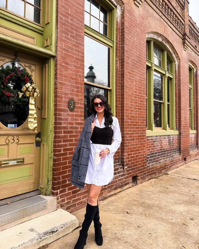 A white shirt dress layered with a black cropped vest, long coat, and suede boots channels festive winter charm perfect for small-town brunch strolls.