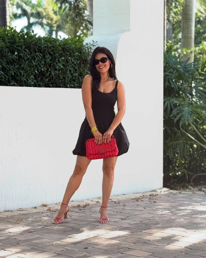 A playful black bubble dress paired with red heels and a matching bag serves flirty summer brunch style with an unmistakably chic attitude.