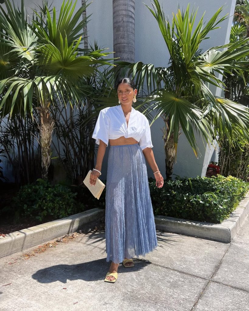 A breezy blue maxi skirt and crisp cropped shirt create a light, romantic summer brunch look that moves beautifully with every step.