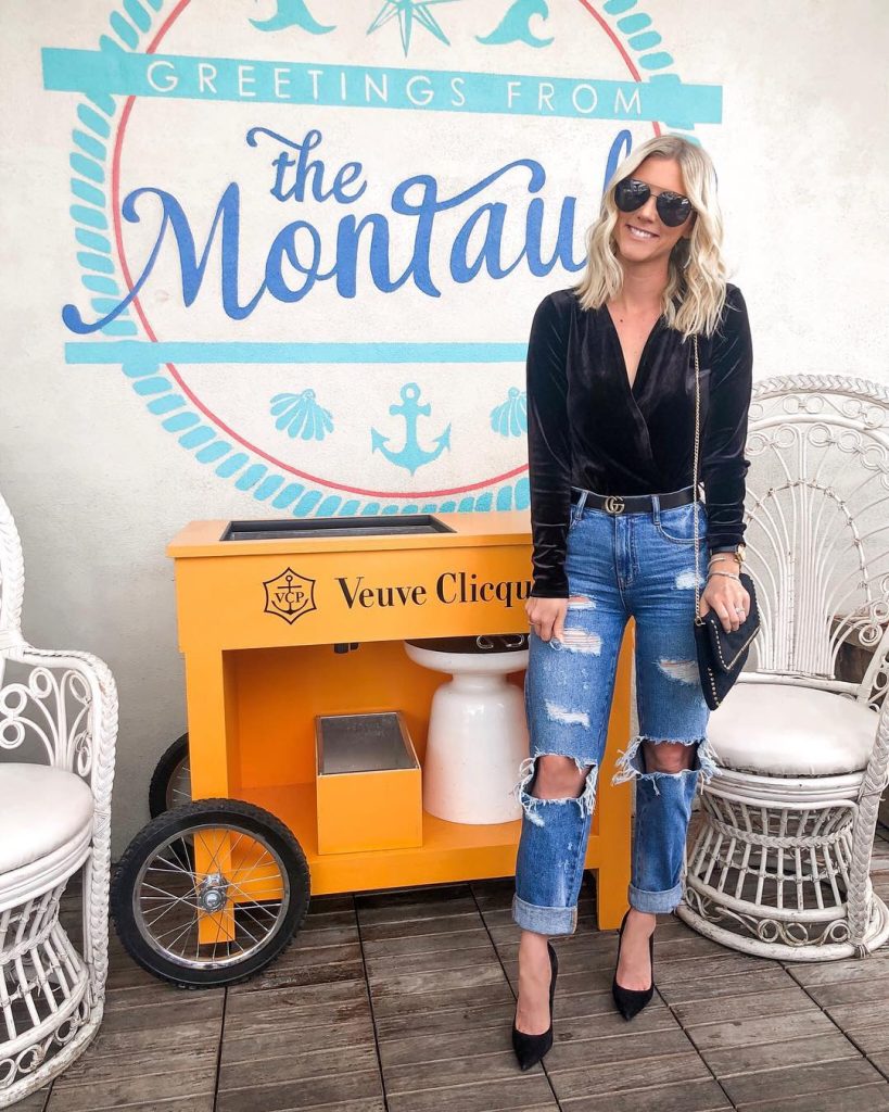 Velvet Wrap Top & Distressed Denim: Montauk-Ready Brunch Glam