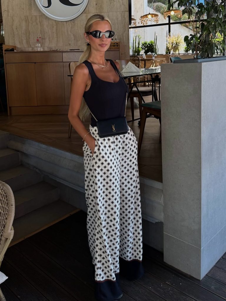 Structured graphic print trousers paired with a sleek black tank and belt bag exude high-end yet easy bistro style—all “fashion editor off duty” OOTD.