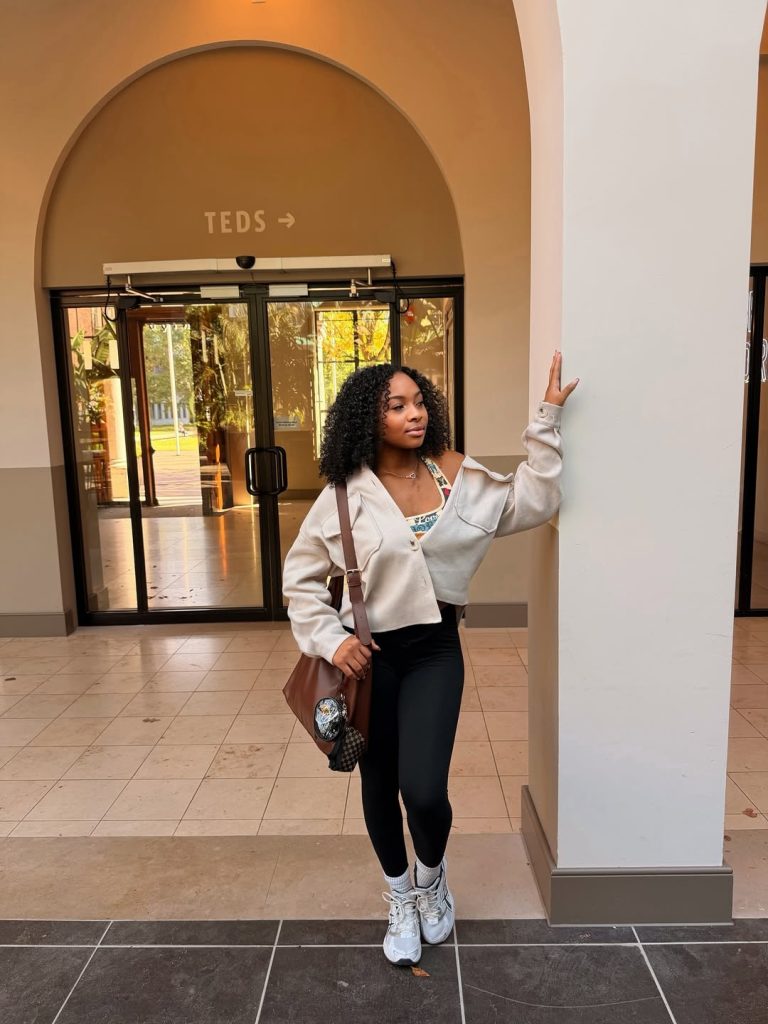 A cropped hoodie, bra top, and leggings with sneakers create a sporty, effortless brunch outfit—it’s perfect for between classes and errands.