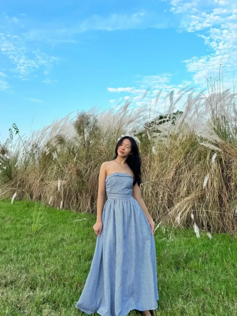 A strappy blue-striped maxi dress provides effortless, daydreamy beauty—a countryside brunch like in a Jane Austen sequel in 2026.