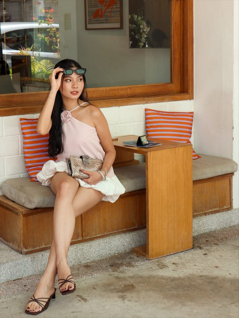A rosette-adorned one-shoulder top and ruffled mini skirt create a flirty coquette vibe, made for city cafés and dessert-focused brunches.