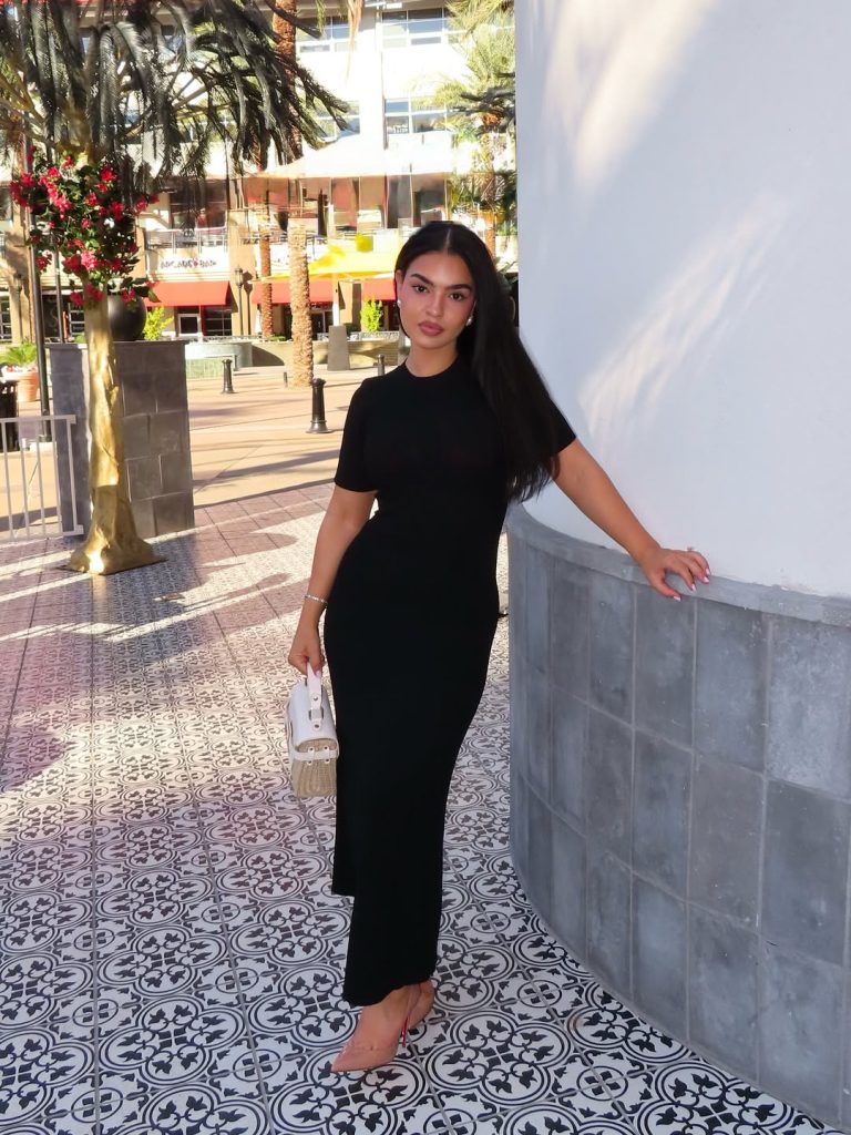 A fitted black maxi dress with nude heels and a fringed white bag offers sleek, evening-ready elegance for late summer or autumn brunch plans.