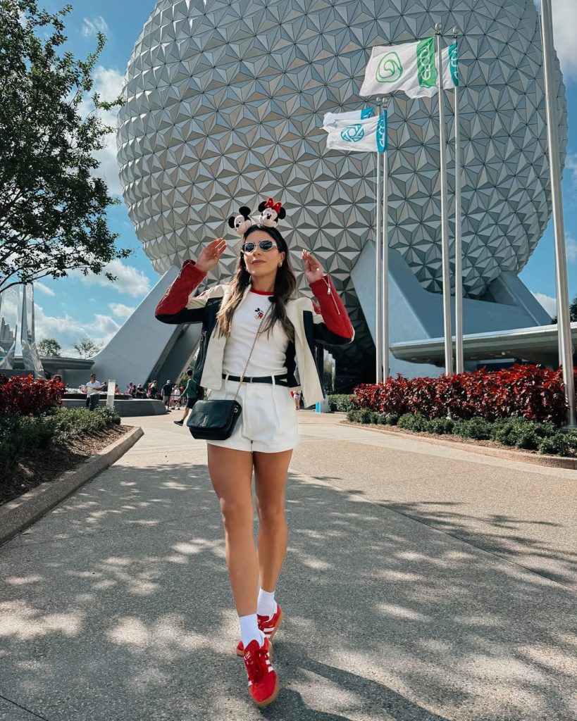 If you have ever tried to take photos during a women’s winter trip to Disney, you know the lighting around the castle is unforgiving. This combination solves that: the bright shorts grab attention while the white top keeps everything clean for night photography. It is a wonderful choice for women in fall and early winter in Florida or California, where the air is cool but not truly cold. Add sheer tights underneath if the forecast dips, or swap sneakers for white platform boots to lean further into the holiday vibe. I would avoid very heavy coats; instead, toss a cropped puffer over your shoulders between photos so the silhouette of the shorts remains visible.