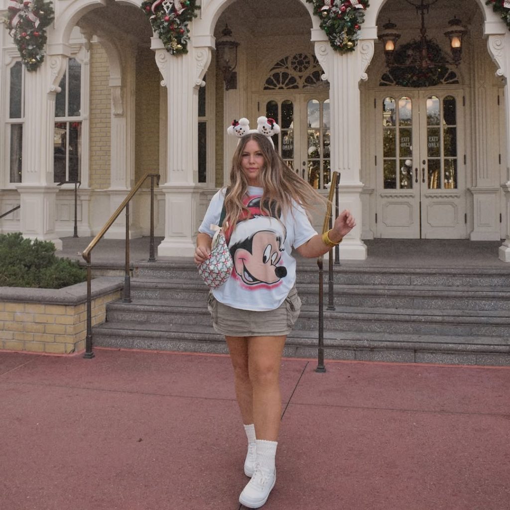 An oversized Christmas Mickey tee paired with a cargo mini skirt makes an easy, festive outfit for holiday park days.