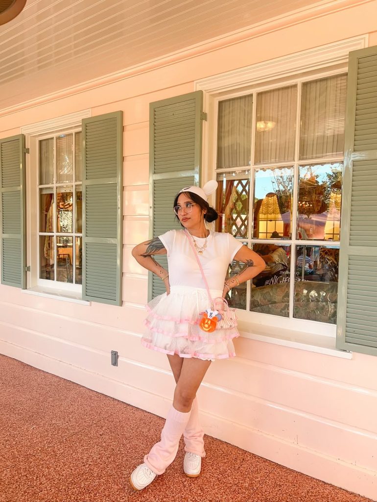 This is perfect inspo for brunch at a monorail resort or a relaxed photo session before heading into the parks. The soft tones flatter many skin tones, including Black women, and pair beautifully with white architecture and greenery. For extra personality, swap the plain socks for frilly ankle versions or add a delicate pendant necklace. I’d avoid bulky backpacks and neon colors; they’d clash with the dreamy pastel story.