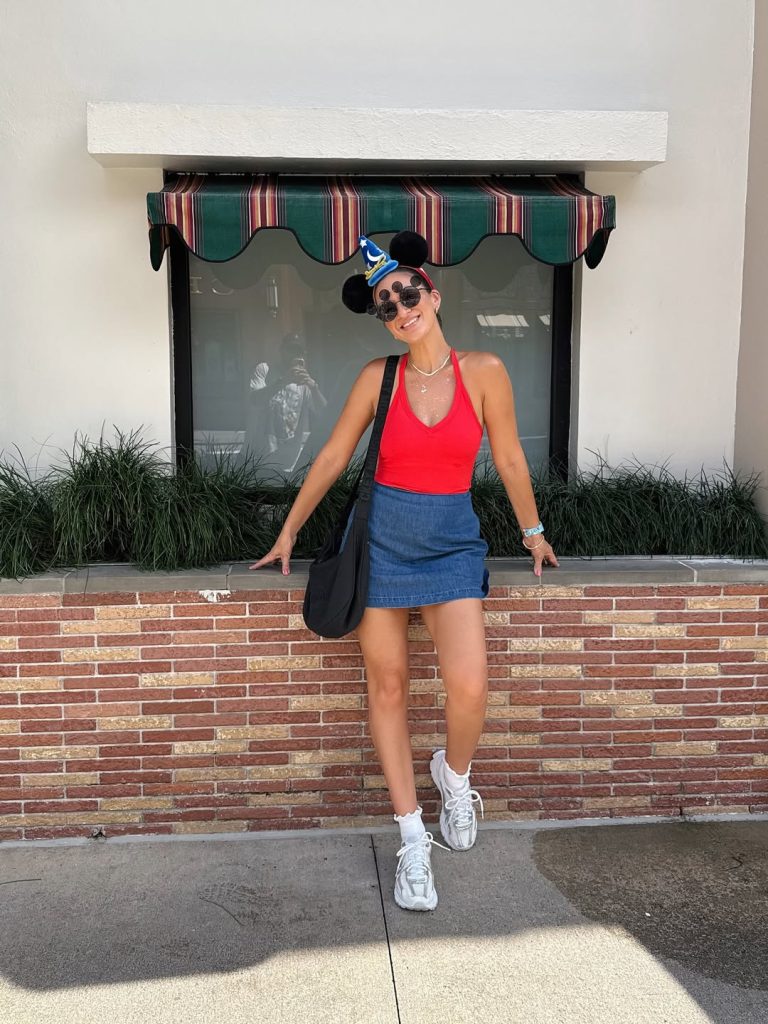 A red halter top and denim mini skirt combined with Sorcerer ears make this sporty option simple and enjoyable on warm summer park days.