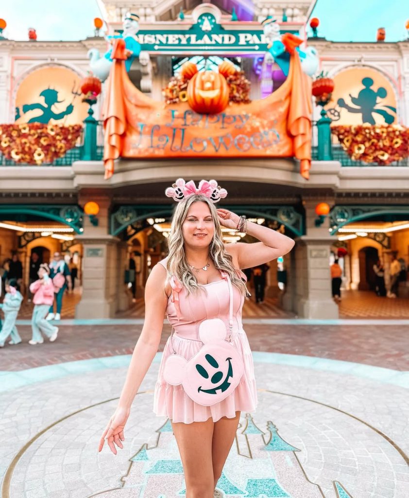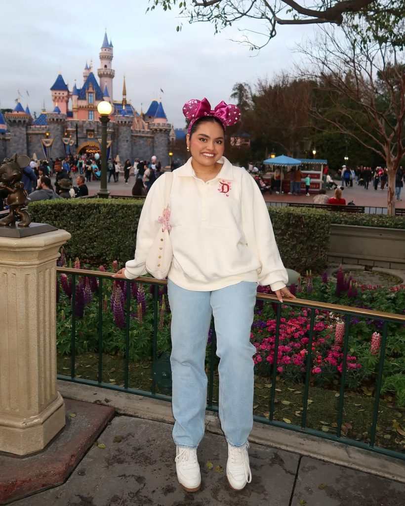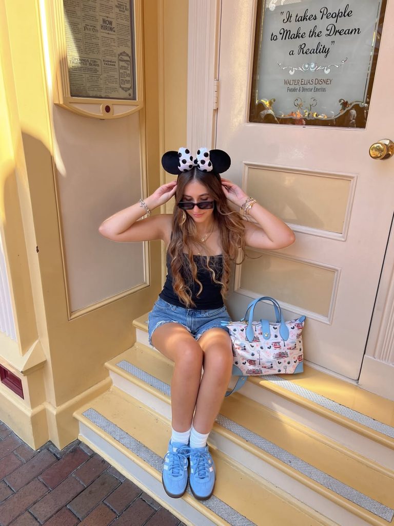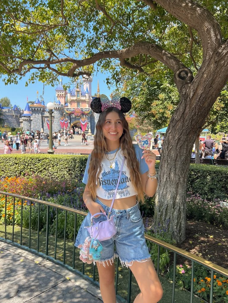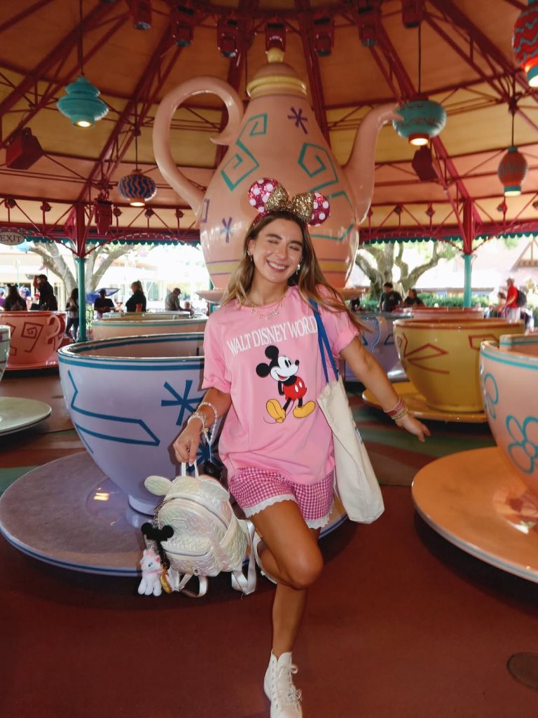 Oversized pink Mickey merch, gingham shorts, and sparkling Minnie ears create a bubblegum aesthetic that’s pure summer inspo for playful park days.