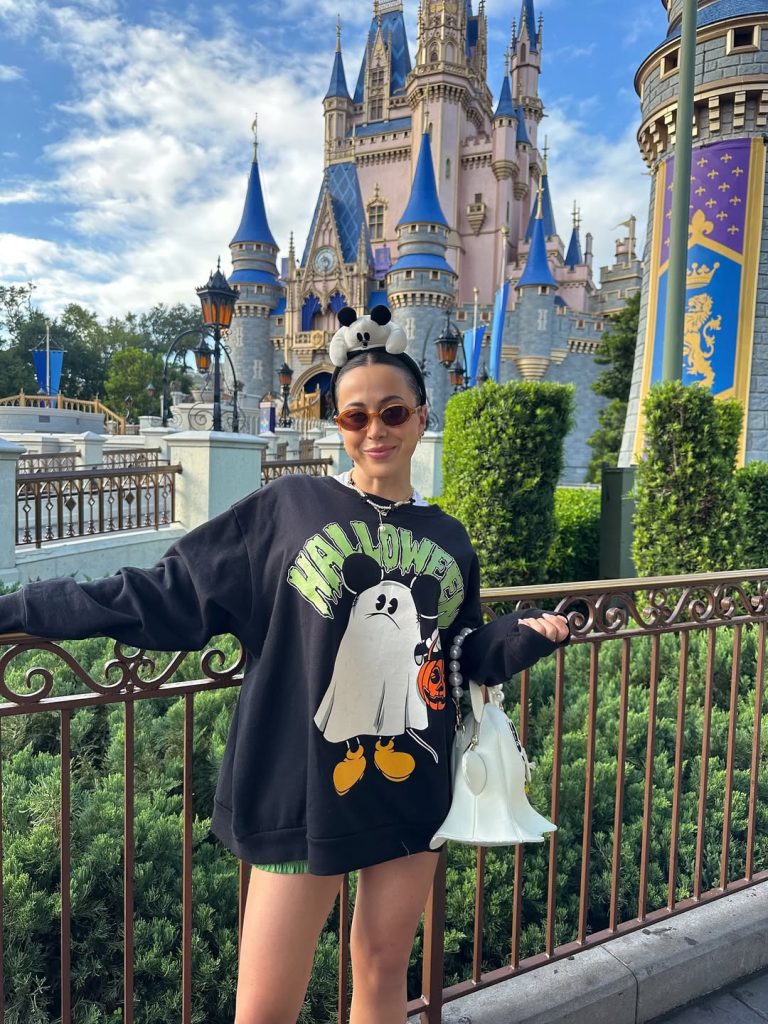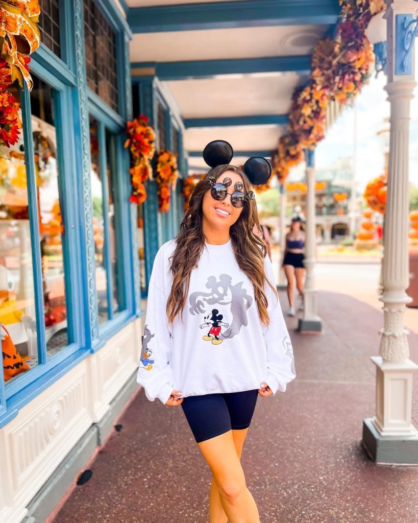 Ghostly Mickey graphics on an oversized sweatshirt, biker shorts, and chunky sneakers make a relaxed Halloween style that still photographs sharply.