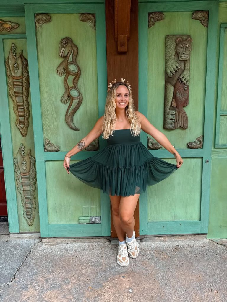 A floaty green mini dress, whimsical headband, and sculptural sneakers come together in a woodland-fairy look that feels right at home in Animal Kingdom-style spaces.