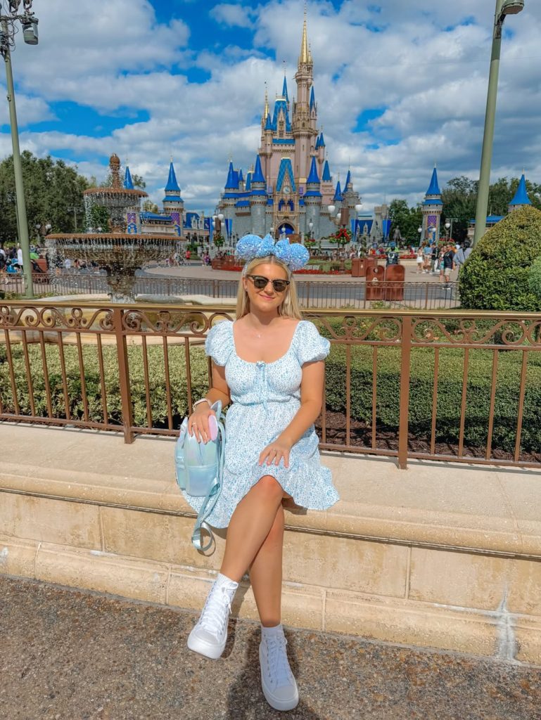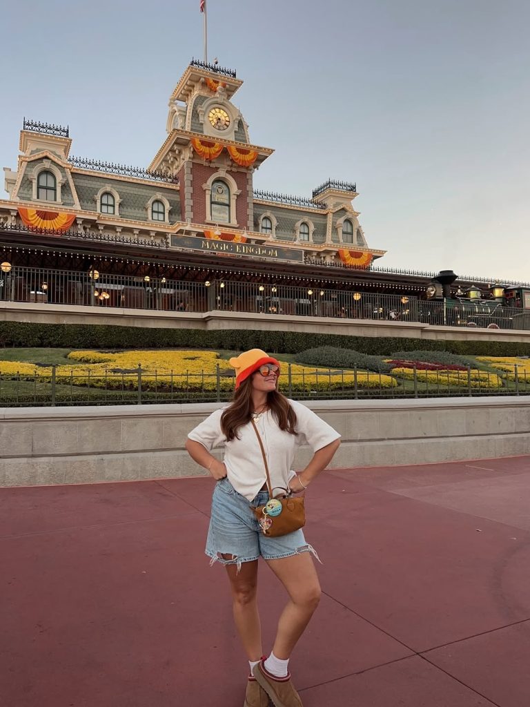 For those steamy July afternoons, this is one of my favorite women’s summer outfit ideas. It is breathable, flirty, and just structured enough to look intentional in photos. The primary color palette subtly echoes classic Disney without leaning into costume territory, making it perfect summer inspo for adults who prefer casual outfits. To customize it, swap the denim for a skort if you plan back-to-back rides or add small character charms to the bag zipper. I would avoid heavy makeup here—sweat and Florida humidity are not forgiving—and instead play with bright nail polish or temporary tattoos as your statement detail.