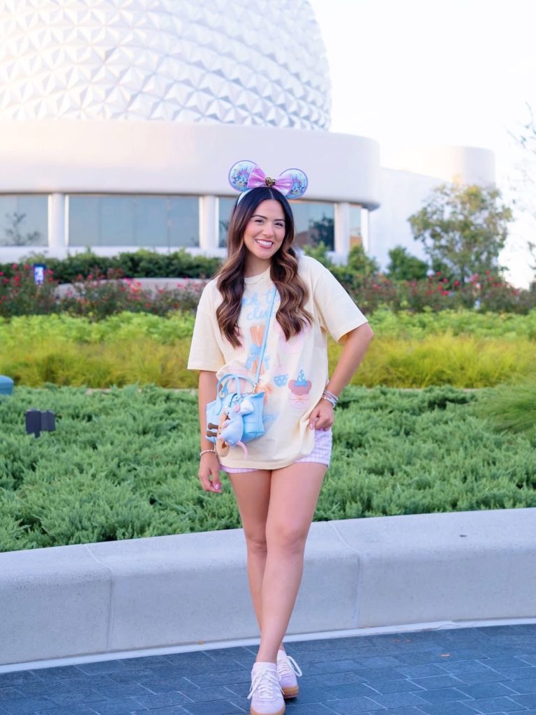 A long pastel graphic tee, gingham shorts, and themed ears create an easy, relaxed uniform for long Epcot days.