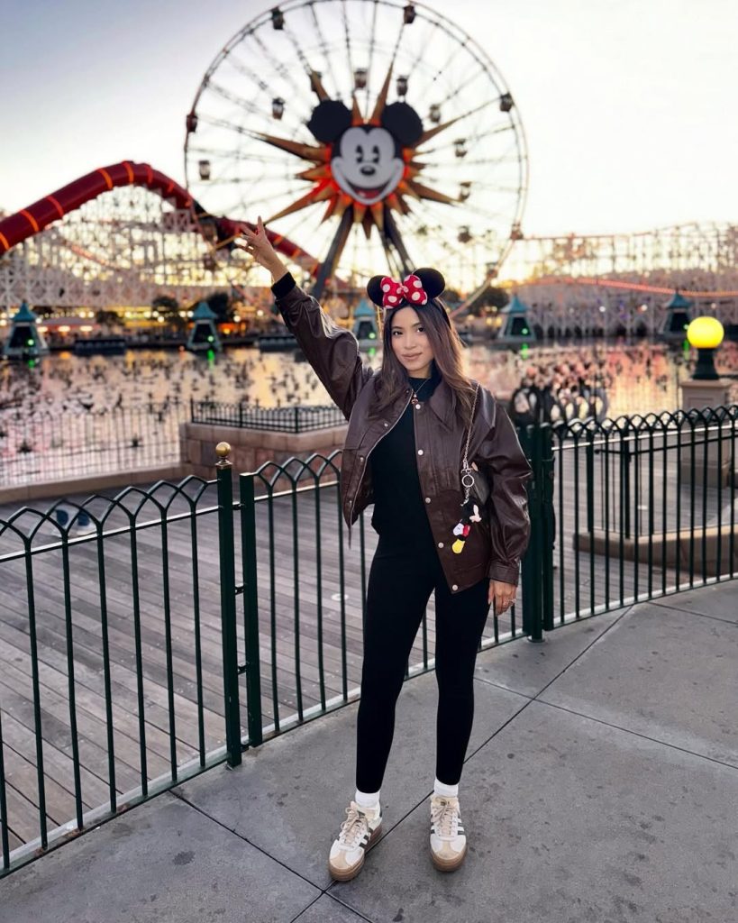 All-black basics with a brown leather jacket and classic Minnie ears create a chic, grown-up outfit for cooler park nights.