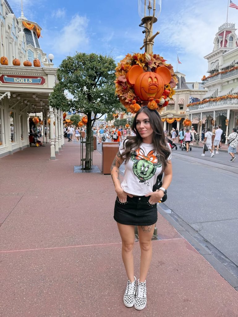 This look is ideal for women who like coverage without sacrificing aesthetic color play. It’s especially good on warm summer days when you want something breezy yet photogenic. Think of it as festival-wear meets Disney—great for snacking around the world or enjoying evening fireworks. To customize, you could knot the tee at the side or add temporary tattoos in pastel hues. I’d skip heavy jeans here; keeping the bottom light maintains that airy, pastel Inspo vibe.