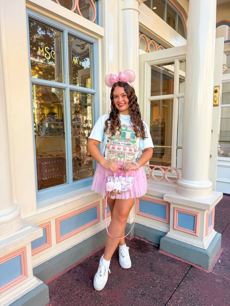 Pastel graphics, a pink tutu skirt, and oversized ears create a sugary-sweet aesthetic perfect for cocoa stands and Main Street Christmas lights.