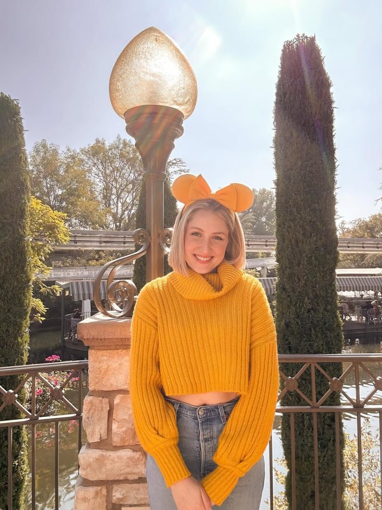 A yellow cropped top with ears paying homage to Winnie the Pooh results in an adorable fall style that still feels bright and playful.