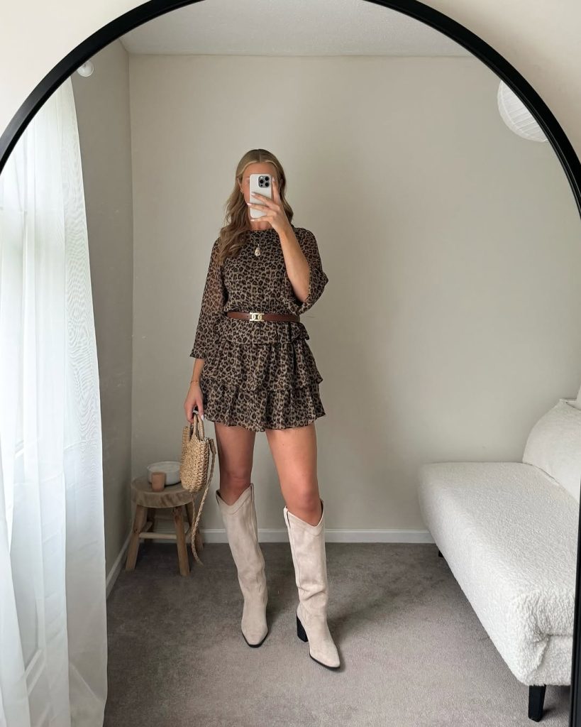 A tiered leopard minidress cinched with a belt and tall suede boots delivers a polished country festival moment that still feels playful.