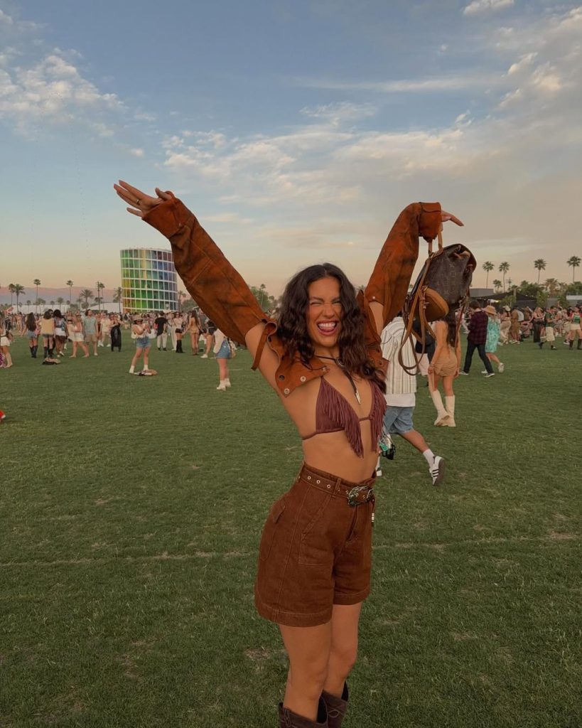 Warm suede shorts, a fringed bralette, and a matching jacket capture that golden-hour summer festival feeling on open grass fields.