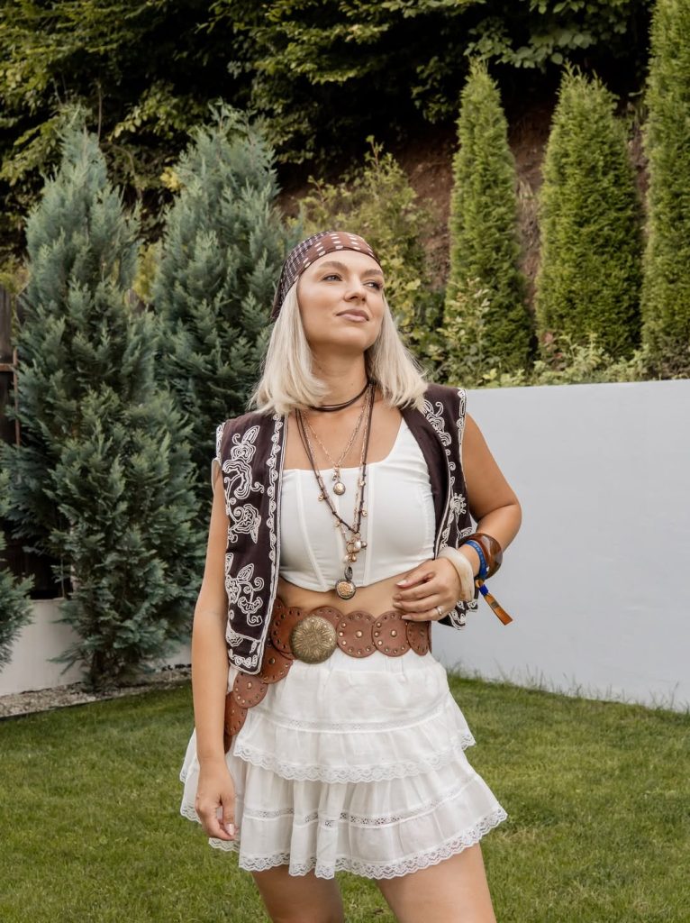 There’s something about this combination that feels made for wandering in between acoustic tents and art installations, gathering some quiet inspiration between the louder sets. In case the breeze picks up, adding a lightweight crochet shrug or kimono is a wonderful idea, especially in the autumn evenings. To keep the balance right, I’d say skip bulkier backpacks, as a slim belt bag in bronze or tan helps keep hands free and the fluid lines of the outfit in focus.
