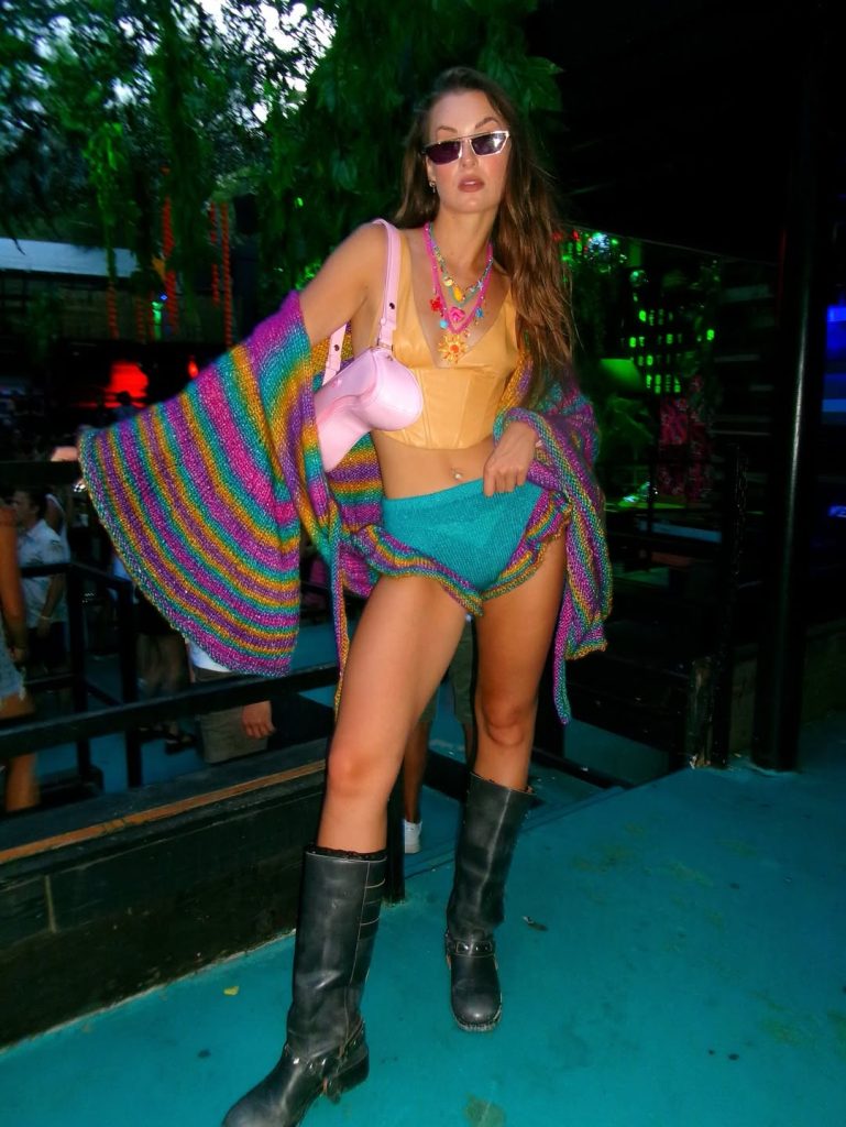 A rainbow knit set, teal shorts, and sturdy boots channel playful EDM energy, perfect for color-drenched dance floors and poolside parties.