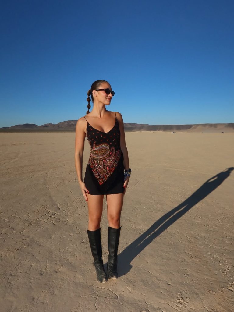 This look works beautifully for art-forward desert gatherings where the music goes late and sand kicks up with every bass drop. To personalize, layer a few delicate gold necklaces or a silk scarf around the wrist. I’d skip heavy jackets here—lightweight dusters or mesh layers keep the silhouette clean while still offering a bit of protection when the wind picks up.