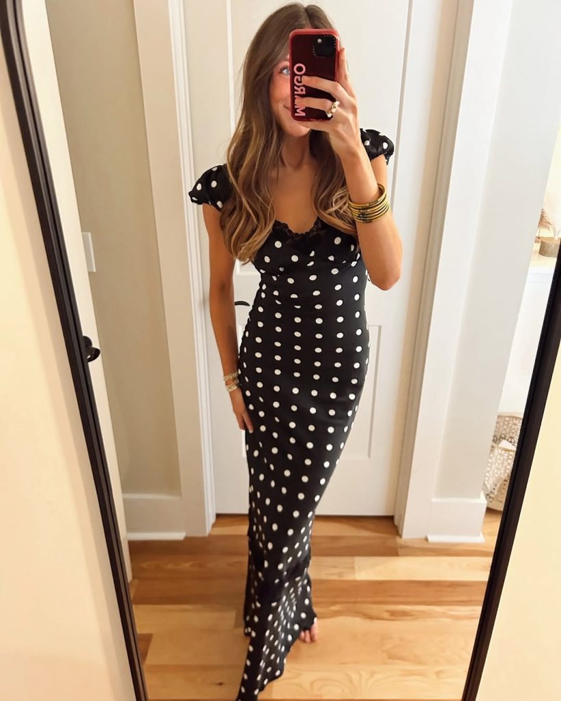 A dotted maxi dress hugs the figure from shoulder to ankle, turning classic polka dots into a quietly sophisticated formal moment.