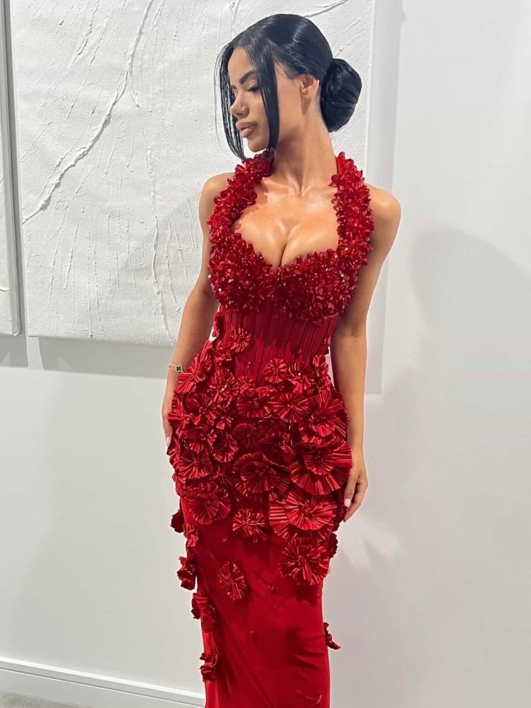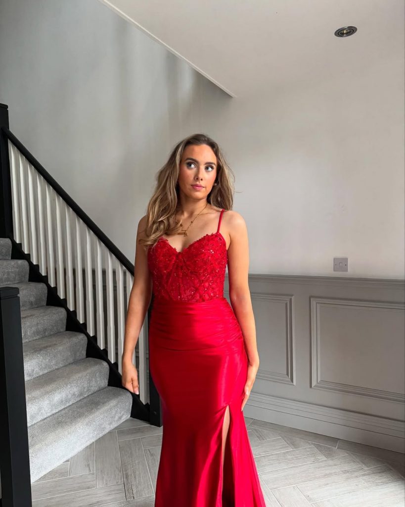 A curve-skimming red gown with a beaded bodice and thigh-high slit delivers instant “main character” energy on any staircase or dance floor.