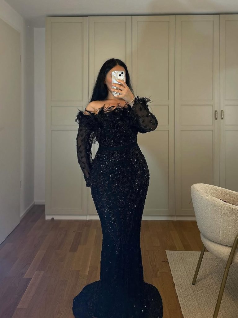 This style is an ideal choice for plus-size women and anyone who desires their dress to make a statement before they have spoken a word. The off-shoulder cut highlights collarbones, while the dark sparkle visually smooths curves—ideal for curvy women who like structure. Brands now offer similar gowns for plus sizes, so don’t hesitate to explore extended size ranges. I’d keep accessories razor-sharp: a slick bun, smoky eye, and compact clutch. Consider the same silhouette in deep emerald green or even printed Ankara fabric if you want to stand out at black-tie weddings or music-industry events. Skip large necklaces; they compete with the feathers and make the neckline feel crowded.