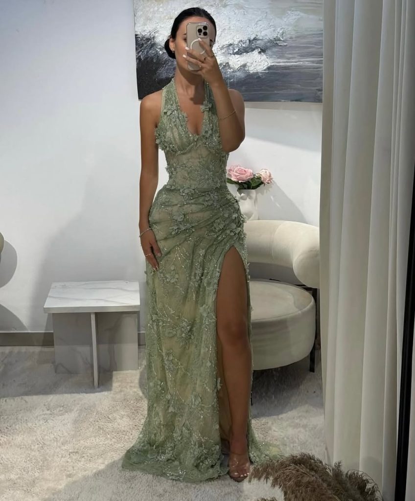 Delicate embroidery and appliqués bloom over an olive green halter gown, creating a soft, garden-party-meets-red-carpet mood.