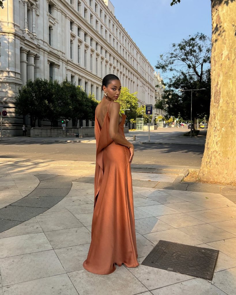 There’s something cinematic about a gown like this against urban architecture; it feels like a still from your movie premiere. The clean column is forgiving for body types that prefer glide over cling, and it’s an elegant option for short women when hemmed to just graze the ground. The saturated color also photographs beautifully alongside navy or charcoal suits for men. I’d style it with a sleek low bun to showcase the back detail and a minimal clutch. If copper isn’t your shade, the same silhouette in deep teal blue or forest green is equally striking.