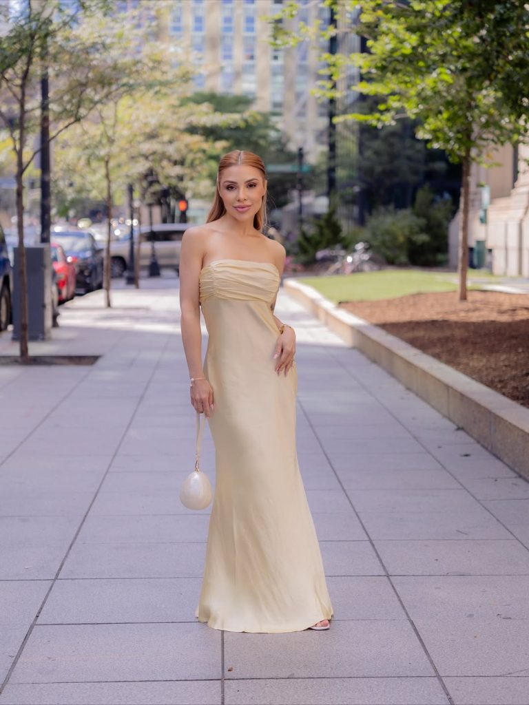 A butter-yellow column dress with a softly ruched strapless bodice brings modern simplicity to formal dressing on a sunlit city sidewalk.