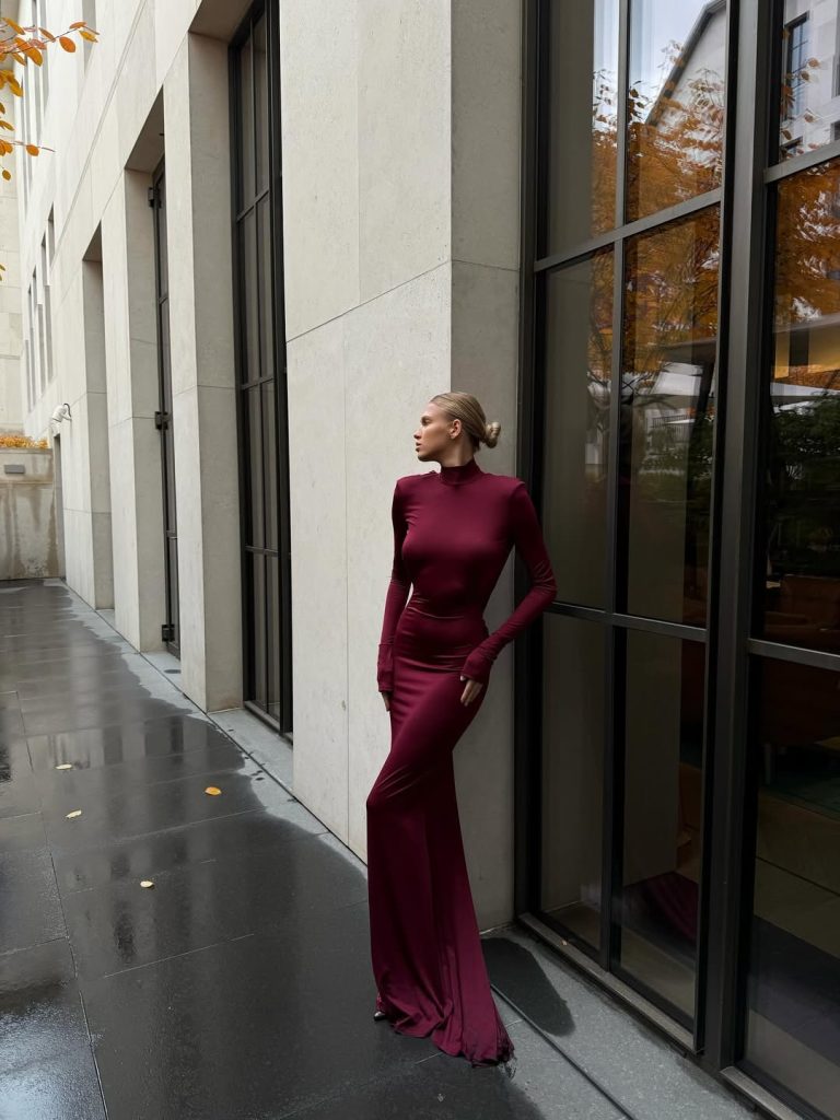 A high-neck, long-sleeve gown in rich burgundy glides along the pavement, proving that covered silhouettes can be just as magnetic.