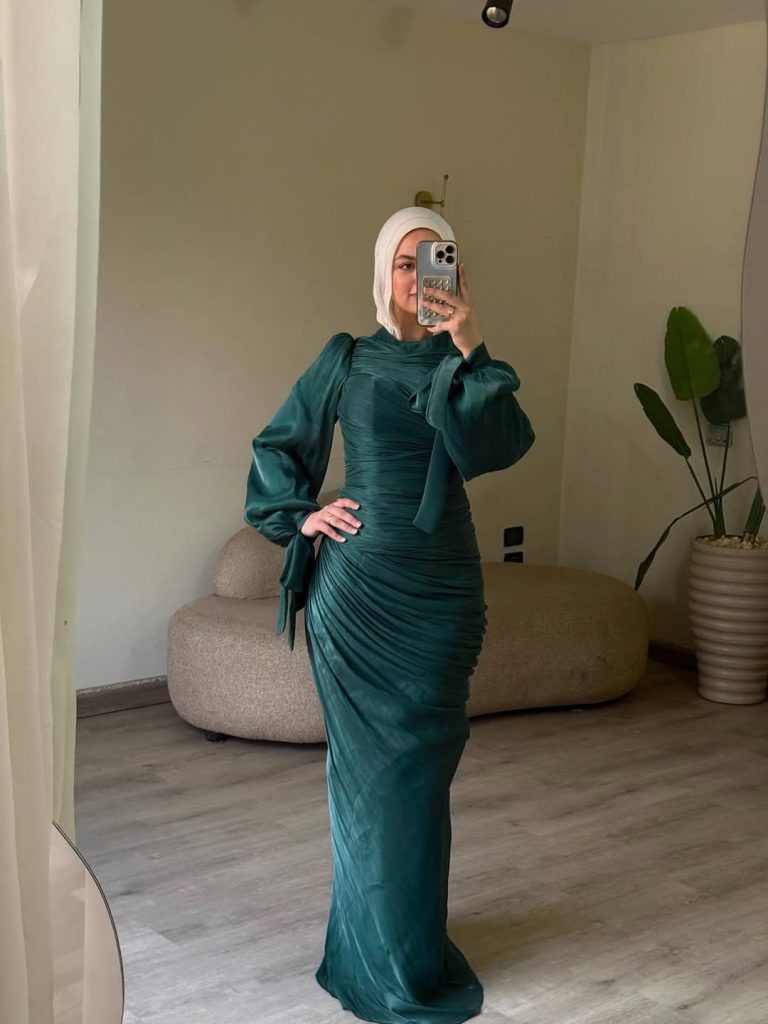 This look feels right at home in ornate ballrooms or family celebrations where elegance and modesty go hand in hand. The diagonal draping at the waist is flattering for plus-size women and especially thoughtful for body types looking for gentle structure over the midsection. It’s a beautiful option for bridesmaids or sisters of the bride in 2026. Add a pearl clutch or delicate crystal earrings for sparkle; avoid heavy belts that would interrupt the soft, column-like flow of the fabric.