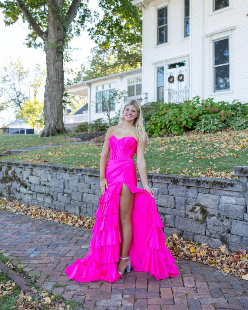 A corseted, high-slit gown in electric pink cascades into ruffled tiers, built for twirling across brick paths and dance floors.
