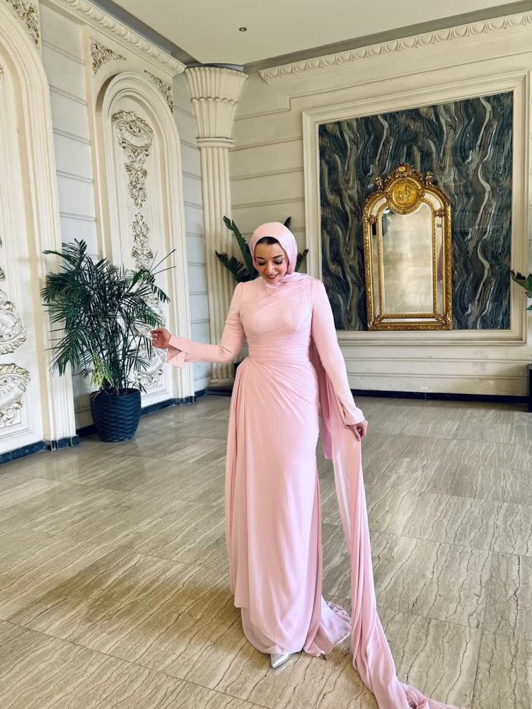 Soft blush fabric wraps into a long-sleeve, floor-sweeping gown with a matching hijab, creating a romantic, fully covered silhouette in pale pink.