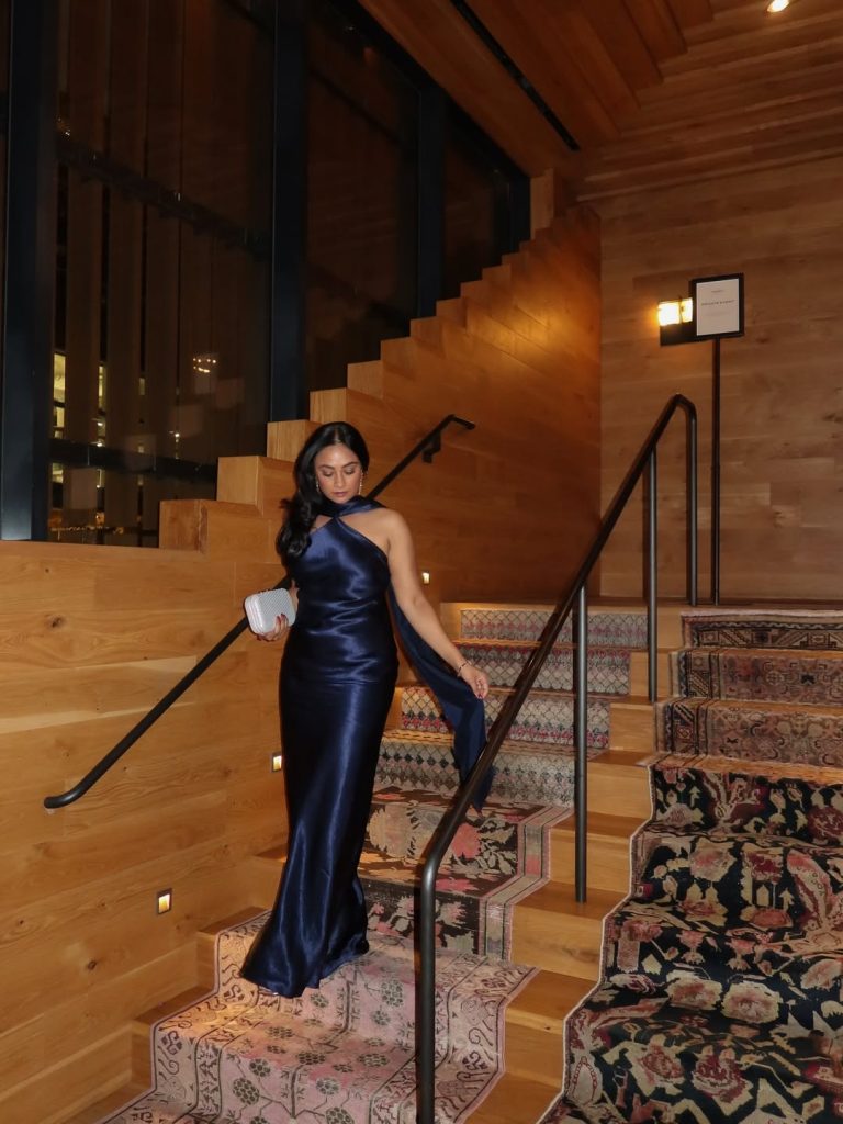 A molten satin gown in rich copper- Brown skims the body with a one-shoulder neckline and sculptural back drape, catching city light with every step.