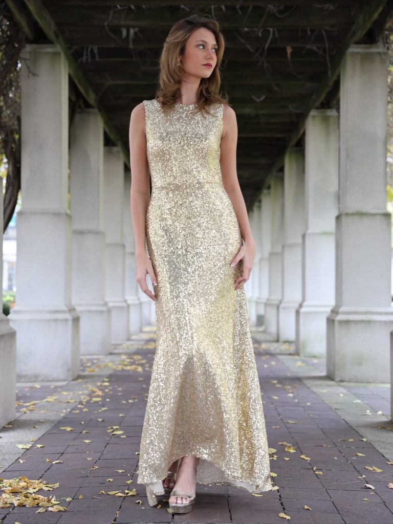 A full-length champagne sequin gown catches every flicker of light, turning a simple column silhouette into a shimmering statement.