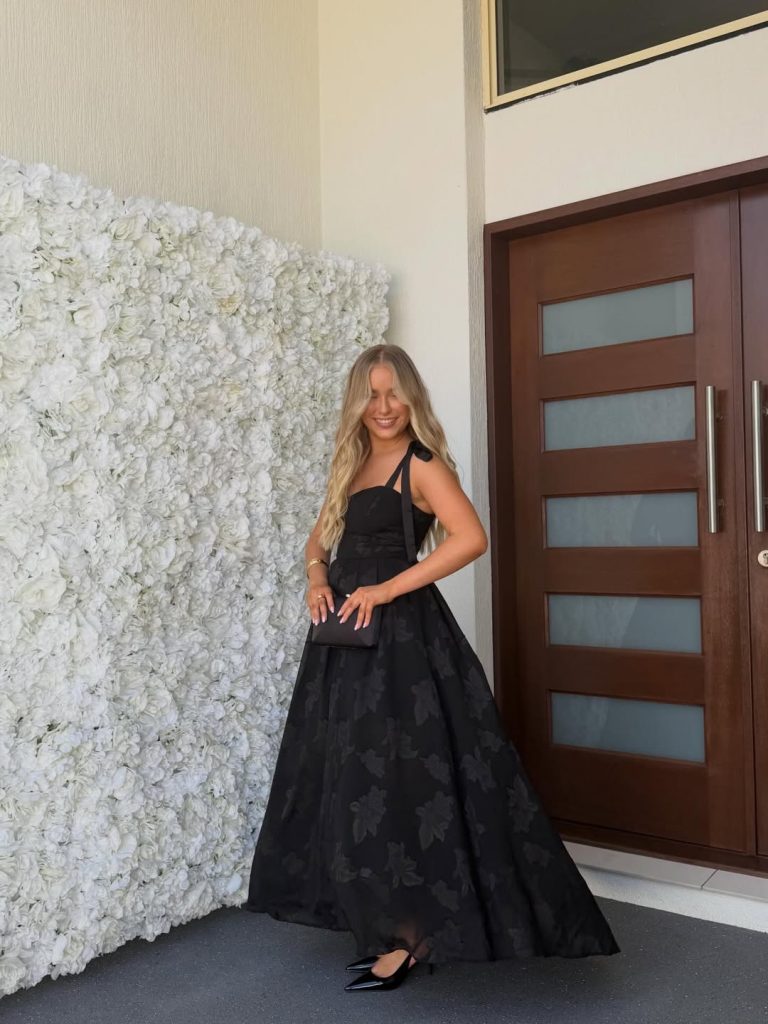 A voluminous black gown with tonal floral motifs blends romance and minimalism, ideal for dress codes that read “formal but fun.”