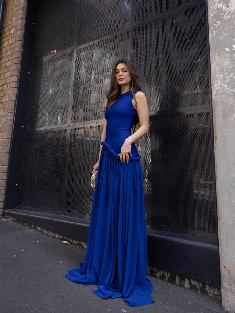 A saturated royal blue gown pairs a sleek sleeveless bodice with a pooled, liquid skirt that trails behind every step.