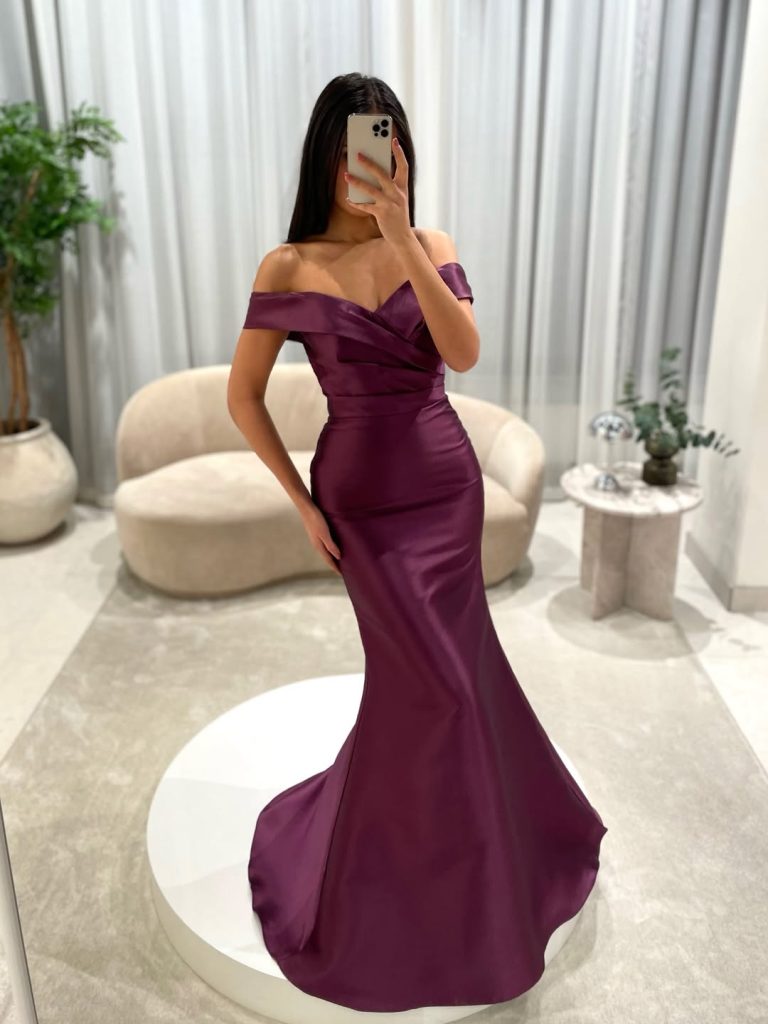 A rich plum gown hugs the body through an off-shoulder neckline and mermaid skirt, delivering drama without a single sequin.