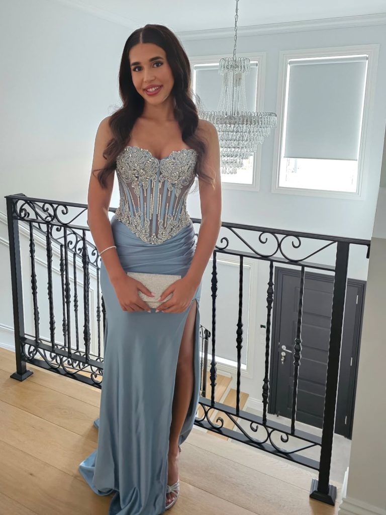 An ice-blue gown with an ornate corset bodice and thigh-high slit feels like a modern fairytale, equal parts princess and runway.