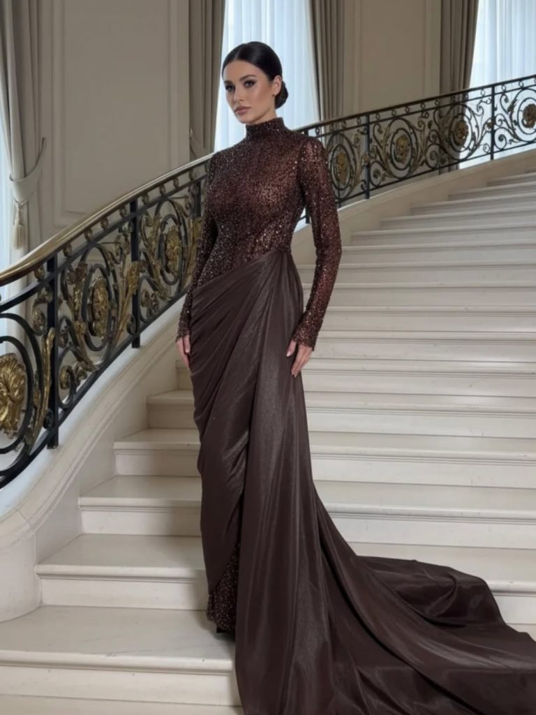 A couture-style gown in deep chocolate Brown combines a sequined base with a sweeping draped overlay, creating museum-level glamour.